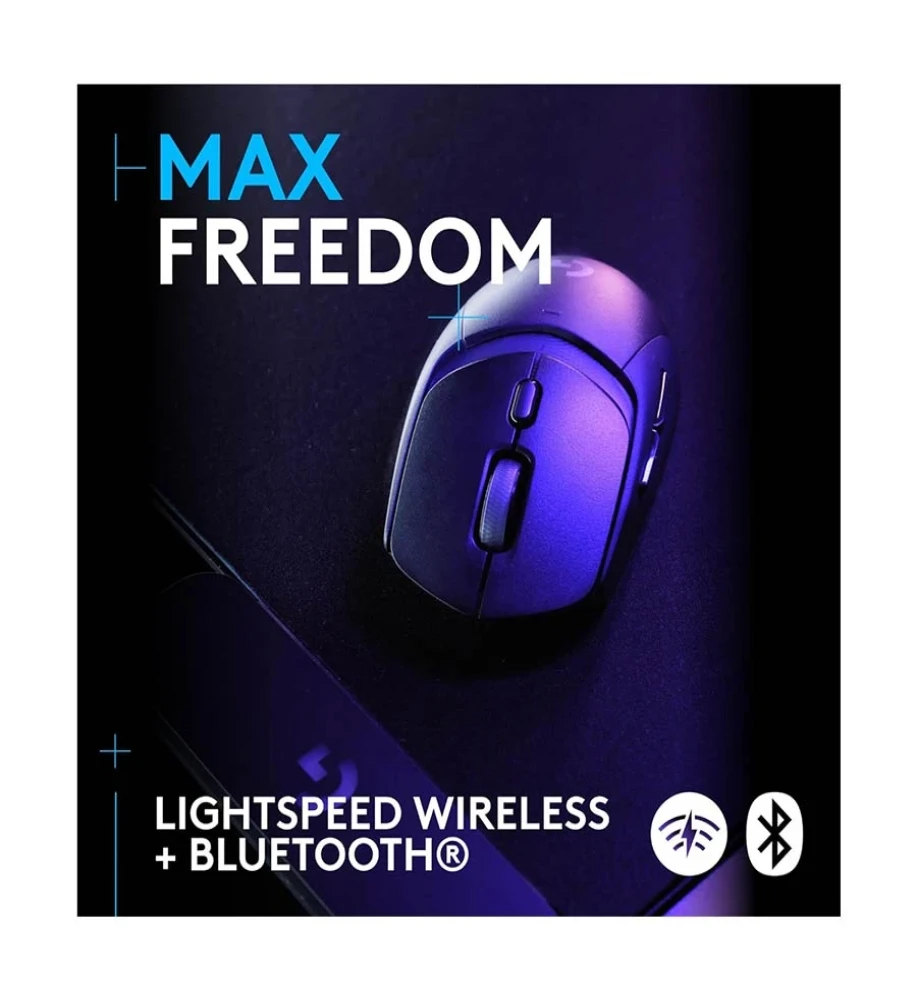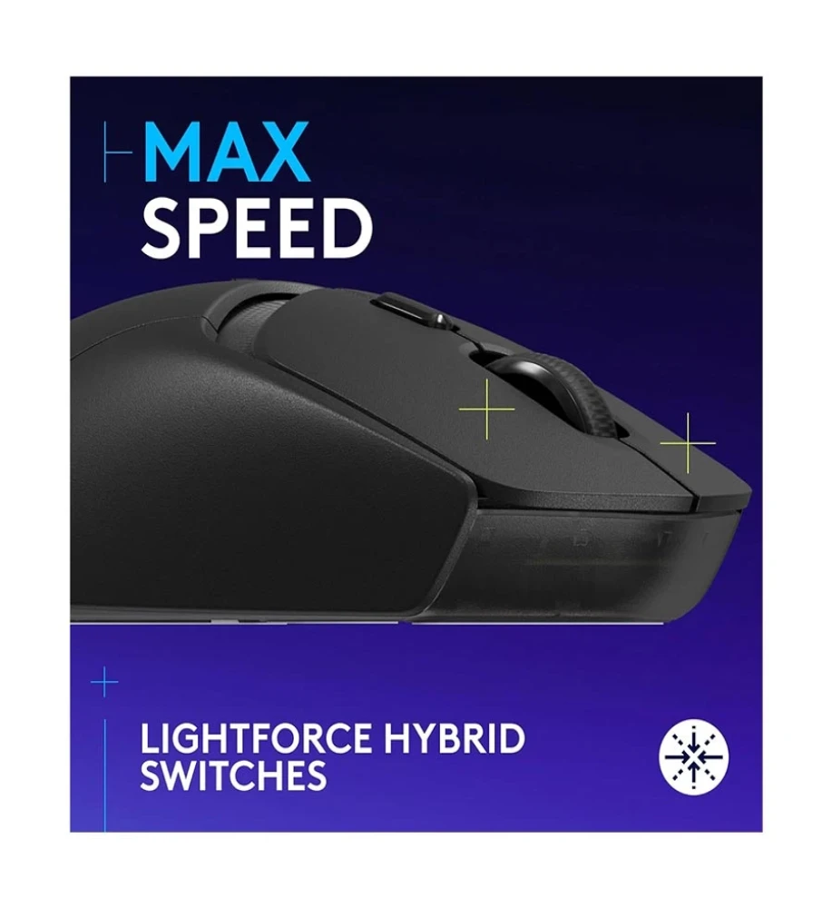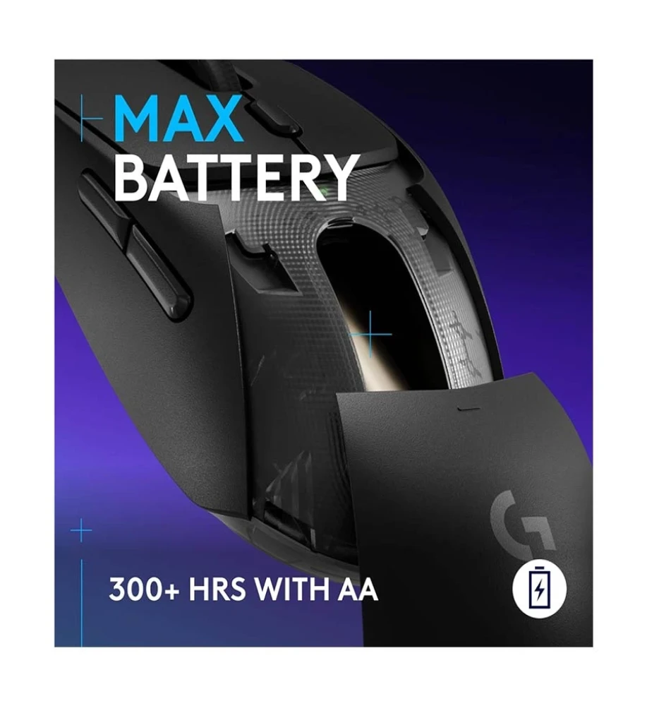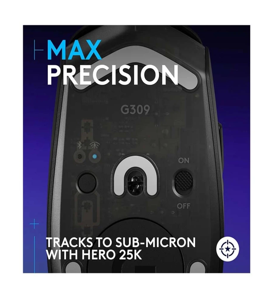LIGHTFORCE SWITCHES hybrid optical-mechanical switches, LIGHTSPEED wireless technology, Up to 5 onboard memory profiles, PTFE Feet, Battery life - Battery life may vary based on user and computing conditions, Constant motion 300+ hrs with LIGHTSPEED Wireless, 600+ with Bluetooth, Bluetooth-enabled device: Windows 10 or later, macOS 13 or later, ChromeOS, Android 4.3 or later, iOS 10 or later, In the box: G309 LIGHTSPEED Gaming Mouse, LIGHTSPEED USB Receiver, USB Cable Extender, Grip Stickers, AA Battery, User Documentation