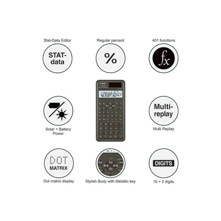 10 + 2 digits: 10-digit mantissa + 2-digit exponential display, Non Programmable Scientific Calculator, Dot matrix display: High-resolution screen provides beautiful looking graphs every time, Regular percent: Regular percentage calculations, Multi-replay: Quick and easy recall of previously executed formulas for editing and re-execution, Solar & Battery: Solar powered when light is sufficient, battery powered when light is insufficient, Plastic keys: Designed and engineered for easy operation, S-V.P.A.M. (Super Visually Perfect Algebraic Method): All the features of the existing V.P.A.M. series plus a new 2-line display and a useful Replay function, STAT-data editor: Back-step viewing and editing of input data, Scientific Constants: can use constant symbols used in physics, science classes, Base-n calculation: Binary/Octal/Hexadecimal, Basic Mathematical Functions: Trigonometric, Exponential logarithmic, etc., Basic Statistics: Standard statistics functions such as Mean, SUM, Standard Deviation, and Regression, Metric conversion function: can convert a number in one unit to a number in a different unit. Display format settings: Number Format: Fix, Number Format: Sci, Number Format: Norm, Engineering Symbol, Engineering Notation, Fraction / Decimal Conversion (Fraction Key).