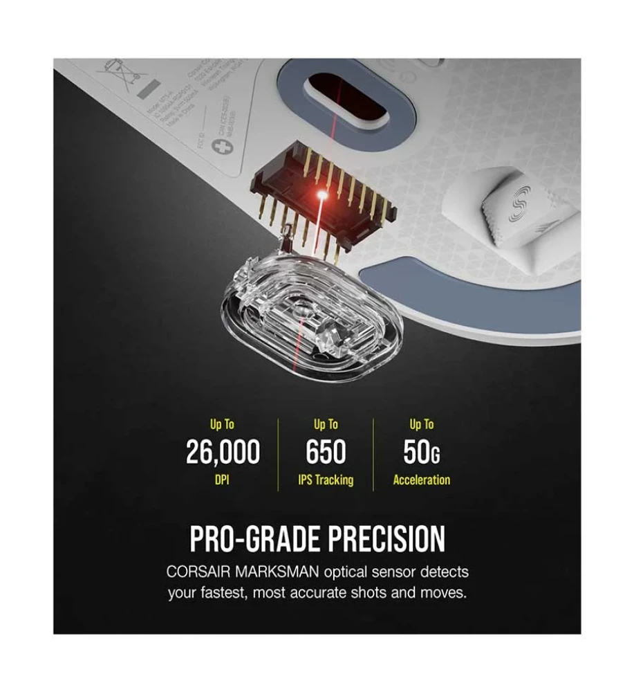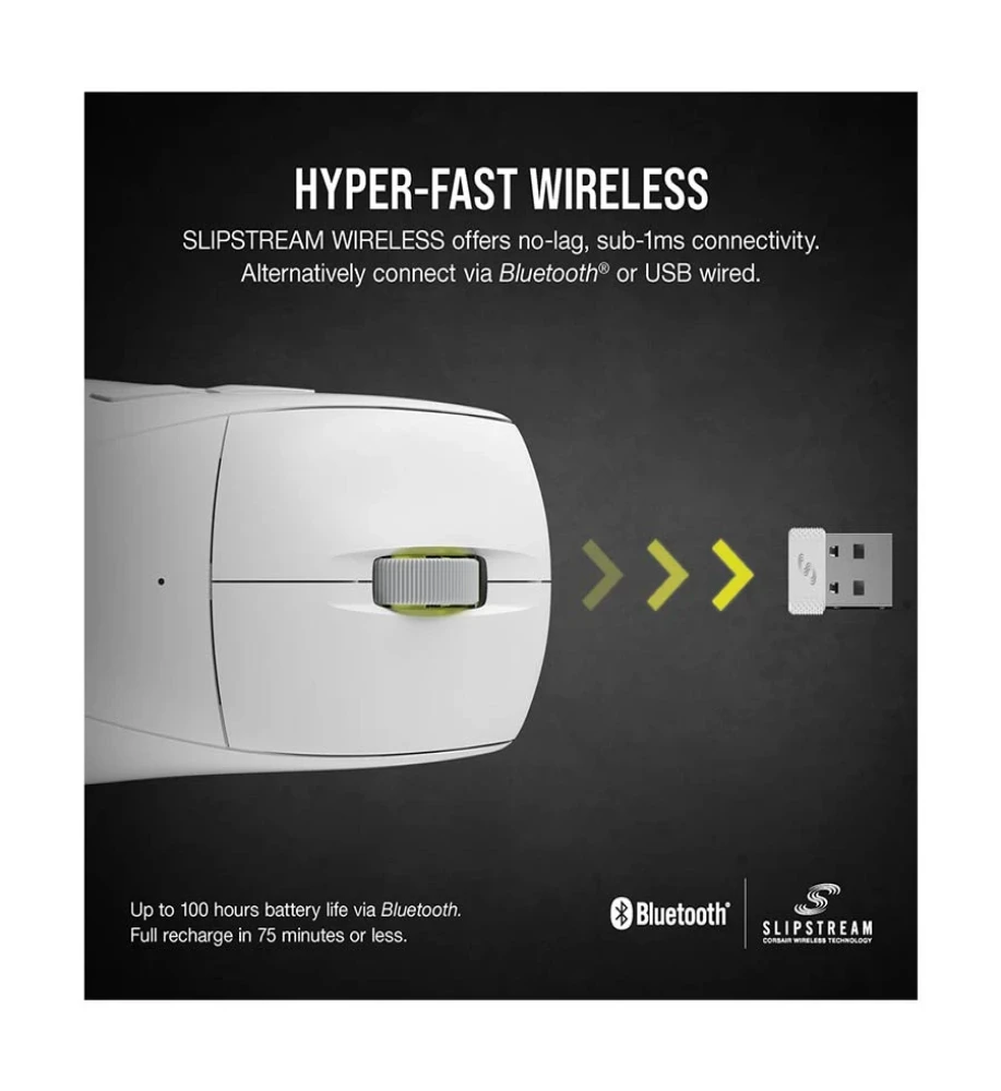 Mouse Compatibility: PC or Mac with a USB 2.0 Type-A port, Windows 10, Windows 11, macOS 10.15 or later, Internet connection for iCUE software download, Game Type: FPS; MOBA; Battle Royale, On Board Memory Profiles: 1, Battery Life: 2.4GHz SLIPSTREAM: Up to 34hrs, Bluetooth: Up to 100hrs, Grip Type: Any, Hand Size: Large, Sensor: MARKSMAN 26K